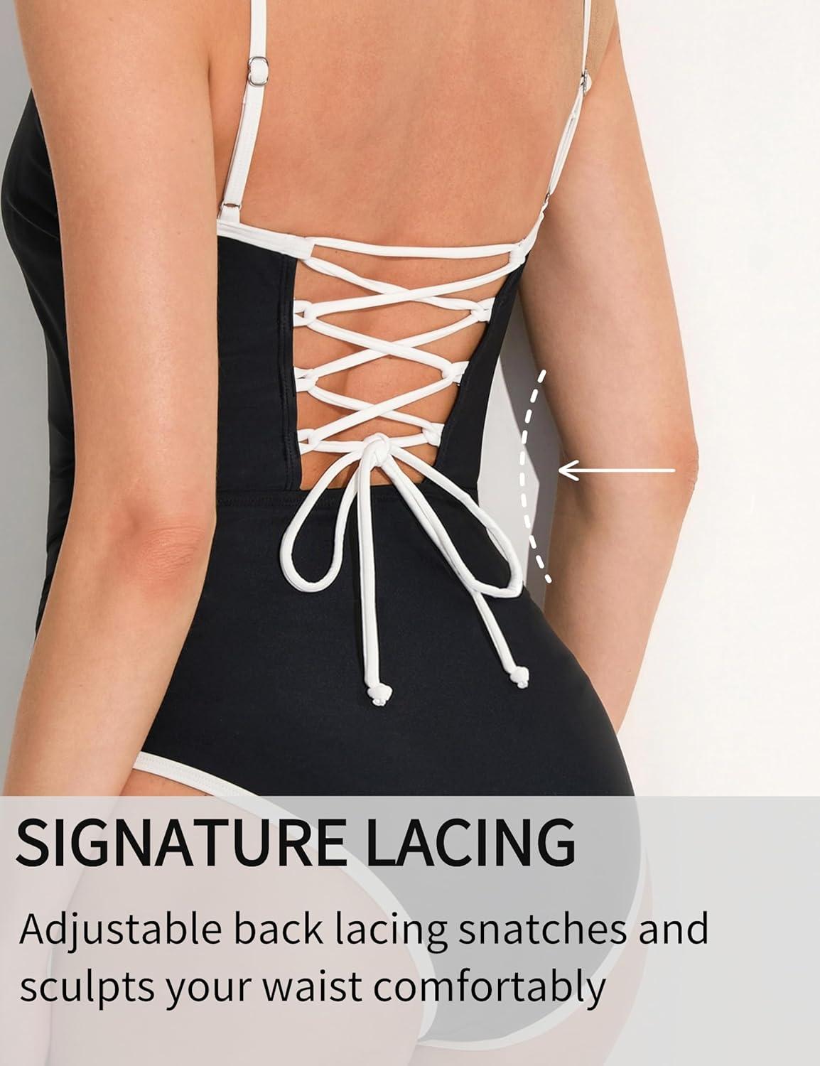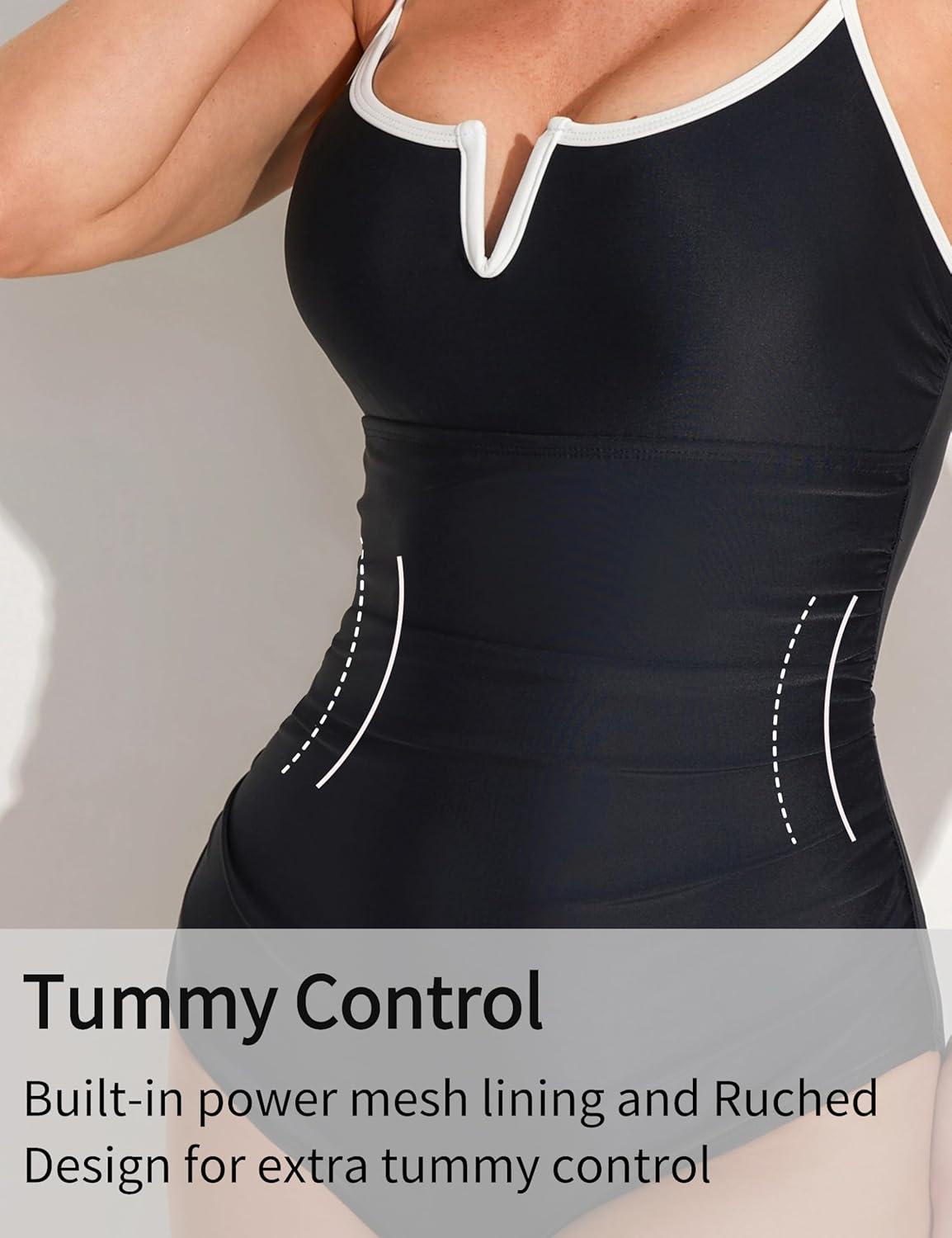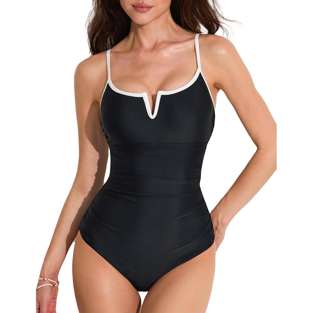 AJISAI Women One Piece Tummy Control Swimsuit Slimming Ruched Backless Bathing Suit Padded Swimwear(Black White V-neck)