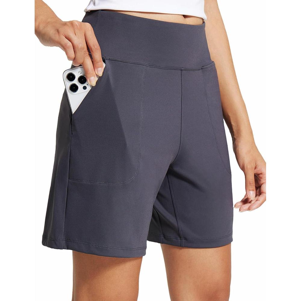 AJISAI Women’s 6.5″ Athletic Long Shorts with Zippered Pockets High Waisted Bermuda Shorts for Walking Running Casual(Dark Grey)