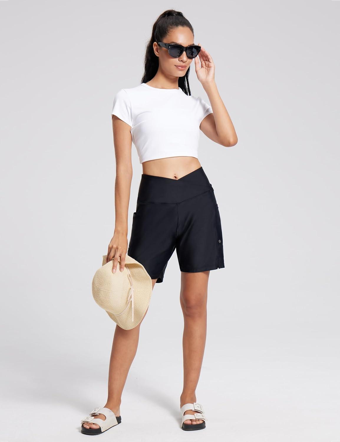 imageAJISAI Womens 7quot Long Swim Board Shorts High Waisted Swimsuits Quick Dry Beach Bathing Shorts with Liner Side Pockets