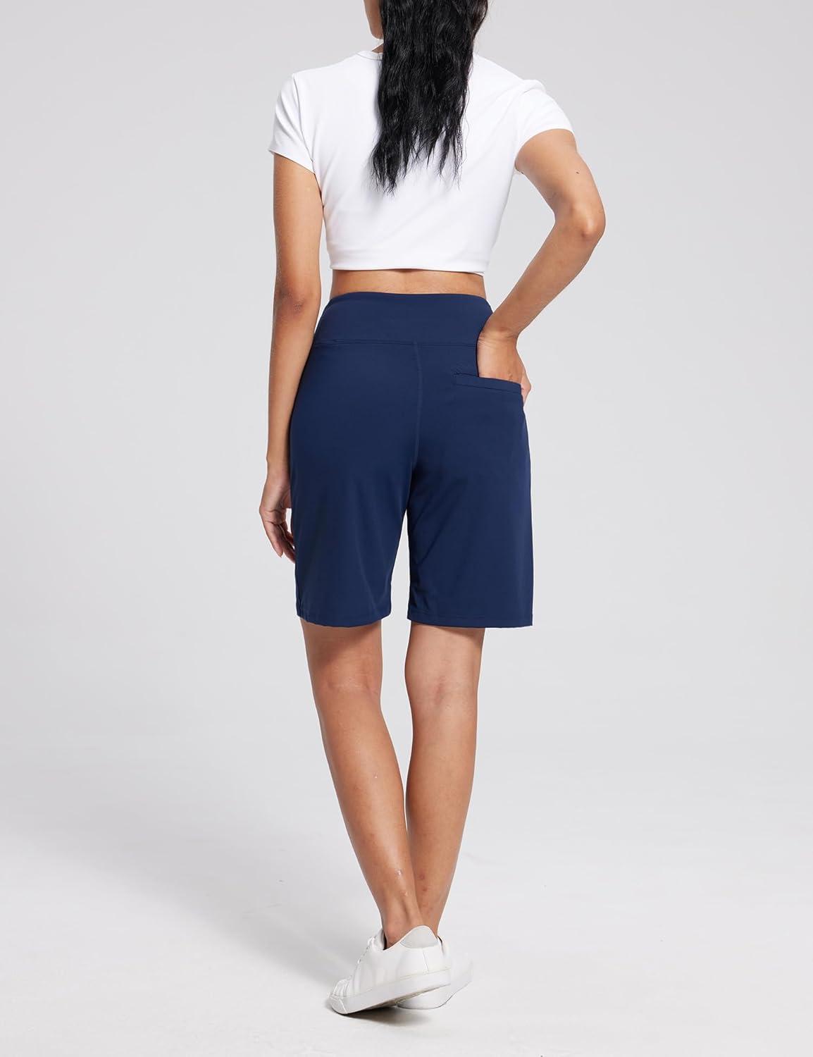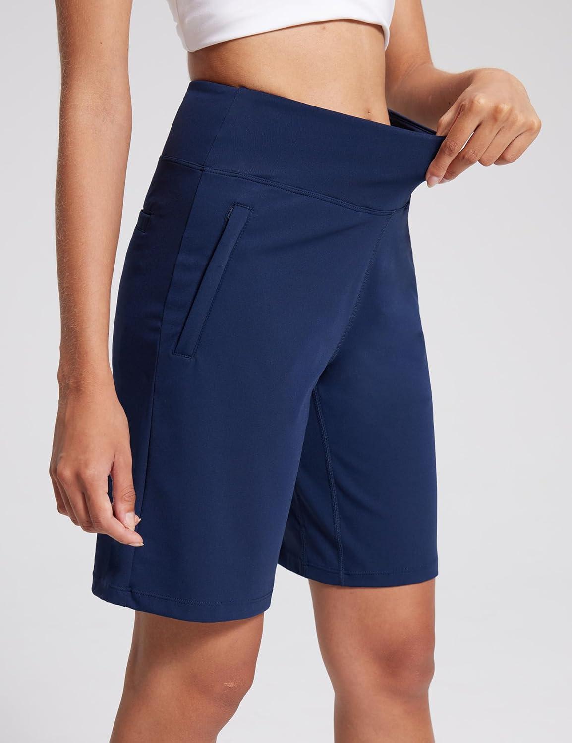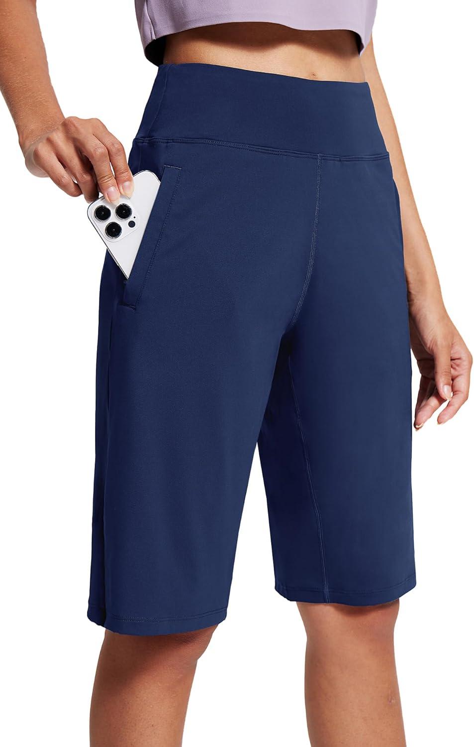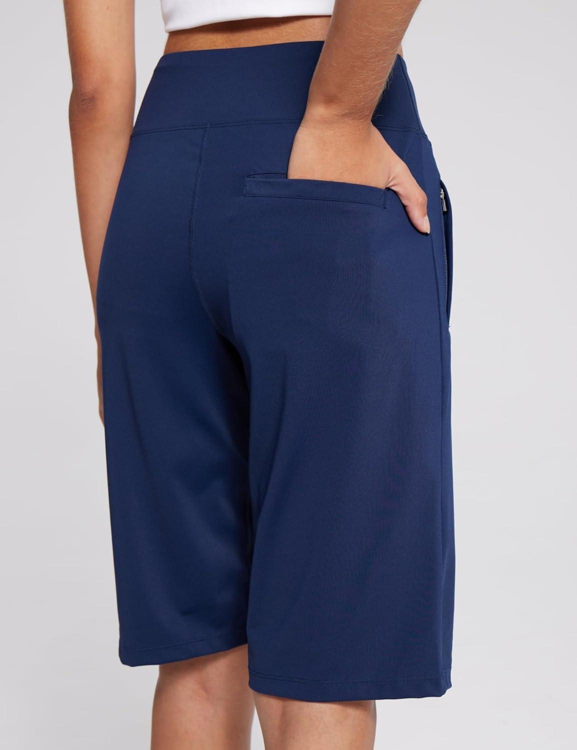 AJISAI Women’s 9″/12″ High Waisted Bermuda Shorts with Zippered Pockets Knee Length Long Shorts for Women Workout Athletic(Dark Blue)