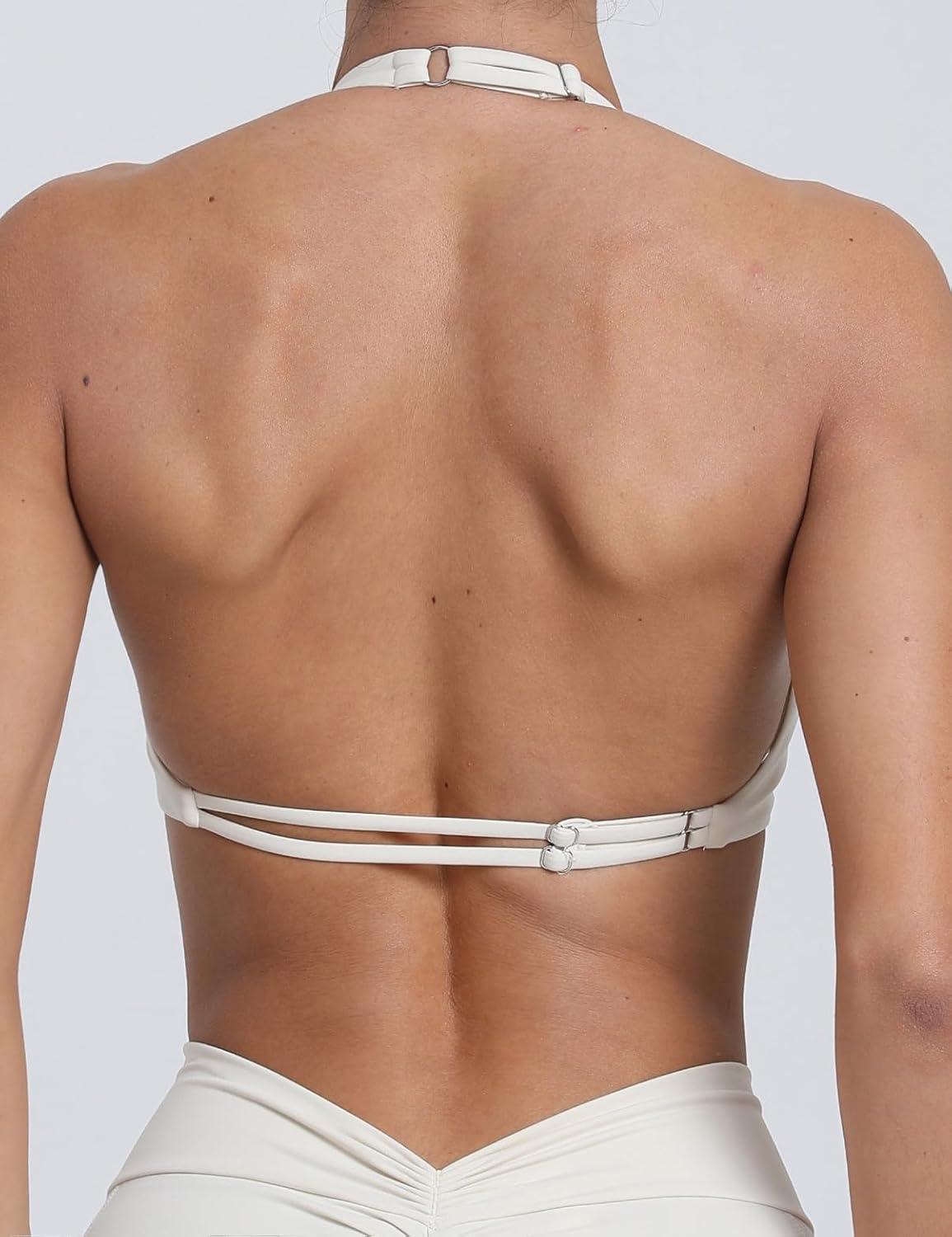 AJISAI Womens Halter Bikini Top Triangle V Neck Bathing Suit Top Low Impact Padded Sports Bra(Ivory White)