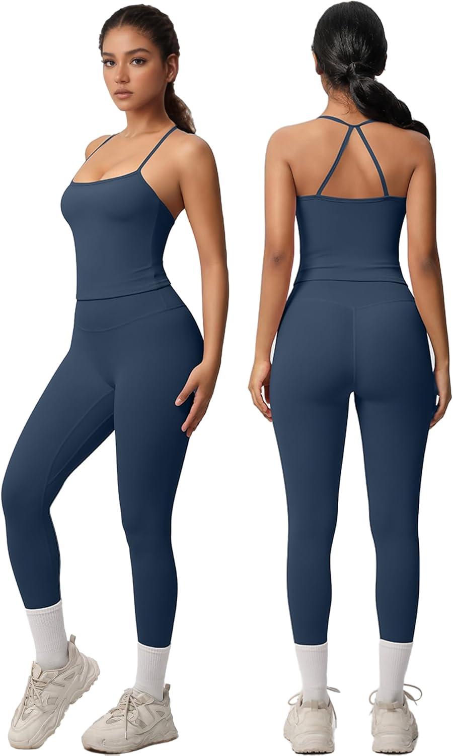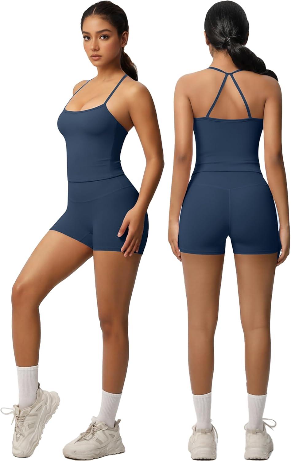 Women 3 Piece Workout Sets Padded Tank Top Sports Bra Matching High Waist Biker Shorts & Gym Yoga Leggings