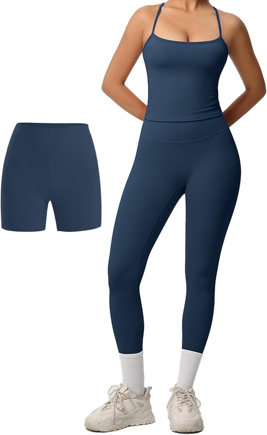 Women 3 Piece Workout Sets Padded Tank Top Sports Bra Matching High Waist Biker Shorts & Gym Yoga Leggings(Navy)