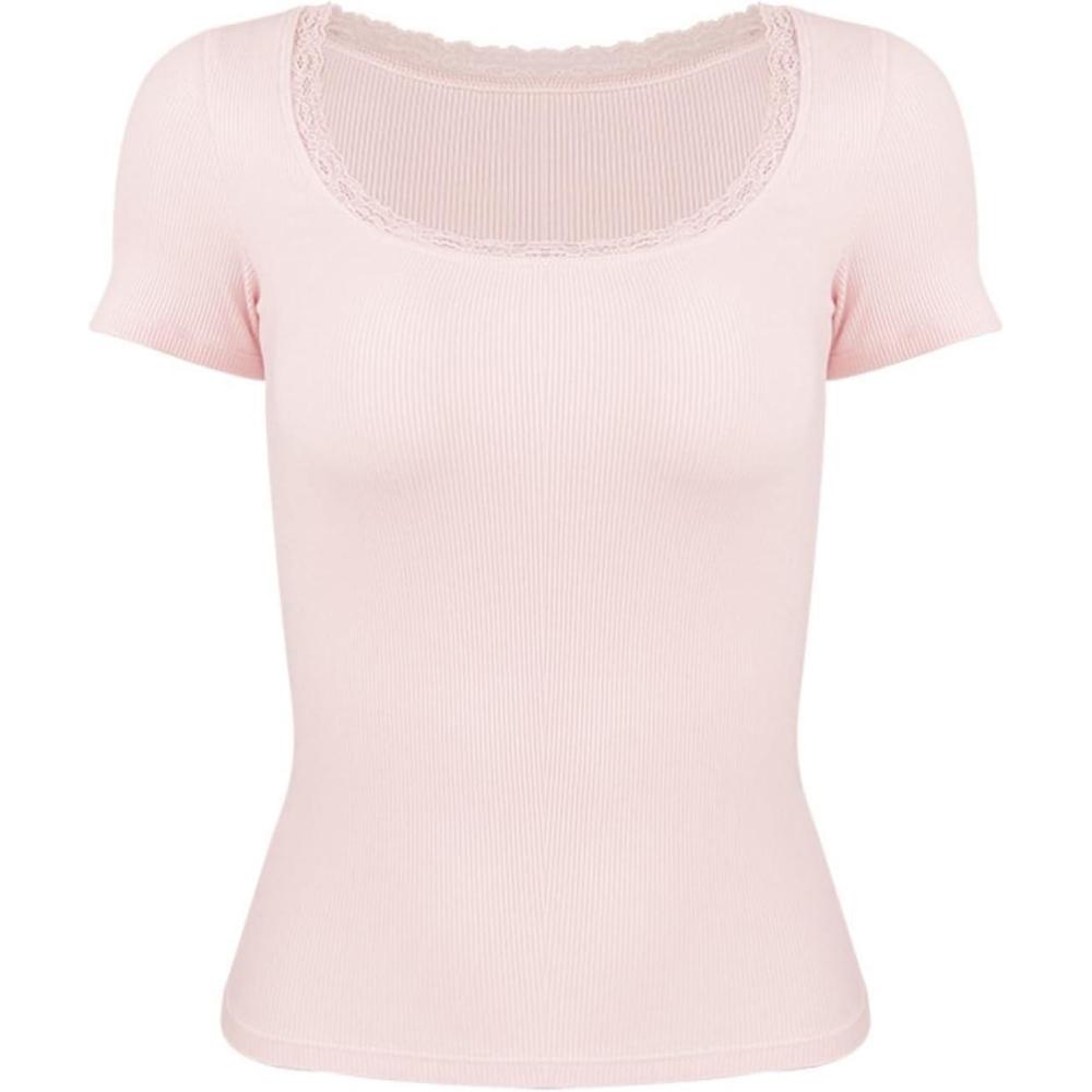 imageWomens Summer Soft Modal Ribbed TShirts with Lace Hem Short Sleeve Round Neck Tops Slim Fit Going Out TeesApink