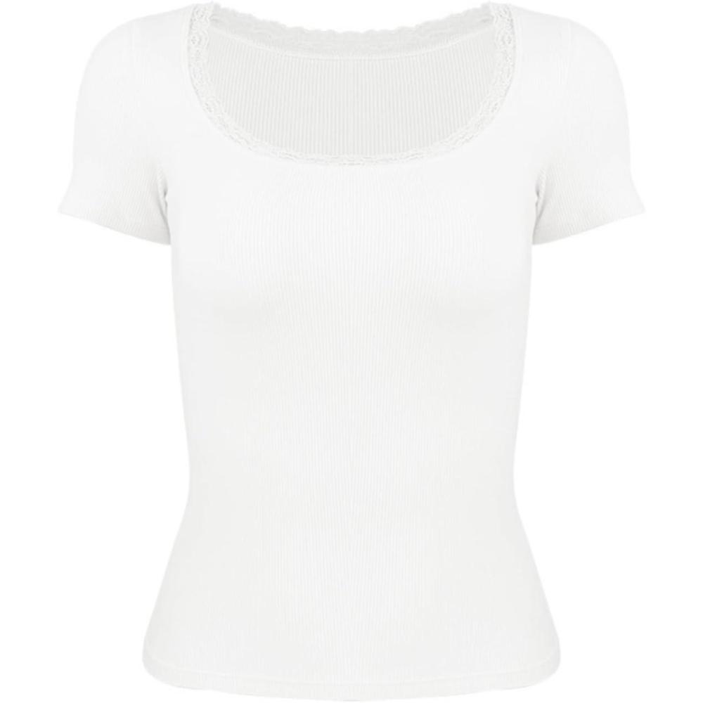 Women’s Summer Soft Modal Ribbed T-Shirts with Lace Hem Short Sleeve Round Neck Tops Slim Fit Going Out Tees(White)